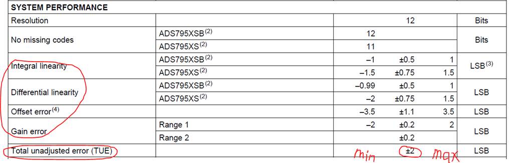 我了解到 、在 特定模拟输入电压下计算 TUE 的方法是取该点所有单独误差最大值的和方根。 但从数据表中可以看出、TUE 值不等于积分线性、差分线性、偏移误差和增益误差的和方根。 为什么? 是否存在数据表中未显示的任何其他误差? 您如何获得 TUE 的典型值(±2 LSB)?