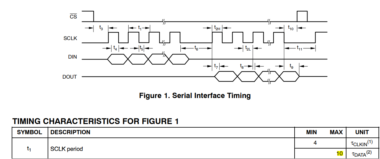 ...我不确定最小值为什么是"10/tDATA"(每10个转换周期1个时钟周期)。 如果 SCLK 在32个转换周期内保持低电平、SPI 接口将超时、而不是10个转换周期、因此这对我来说有点随意。 我将告诉您、如果我能找到有关这种情况的更多信息、我将会告诉您。 但是、我建议 SCLK 不比大约(1/32)/tDATA (即转换周期内至少32个 SCLK 周期)慢、并且最好比这快。 如果 SCLK 频率太慢、以至于它无法发出"RDATA"命令并时钟输出24位数据、那么它将太慢、无法捕获每个转换结果。 虽然 SPI 通信可能起作用、但这并不实用。