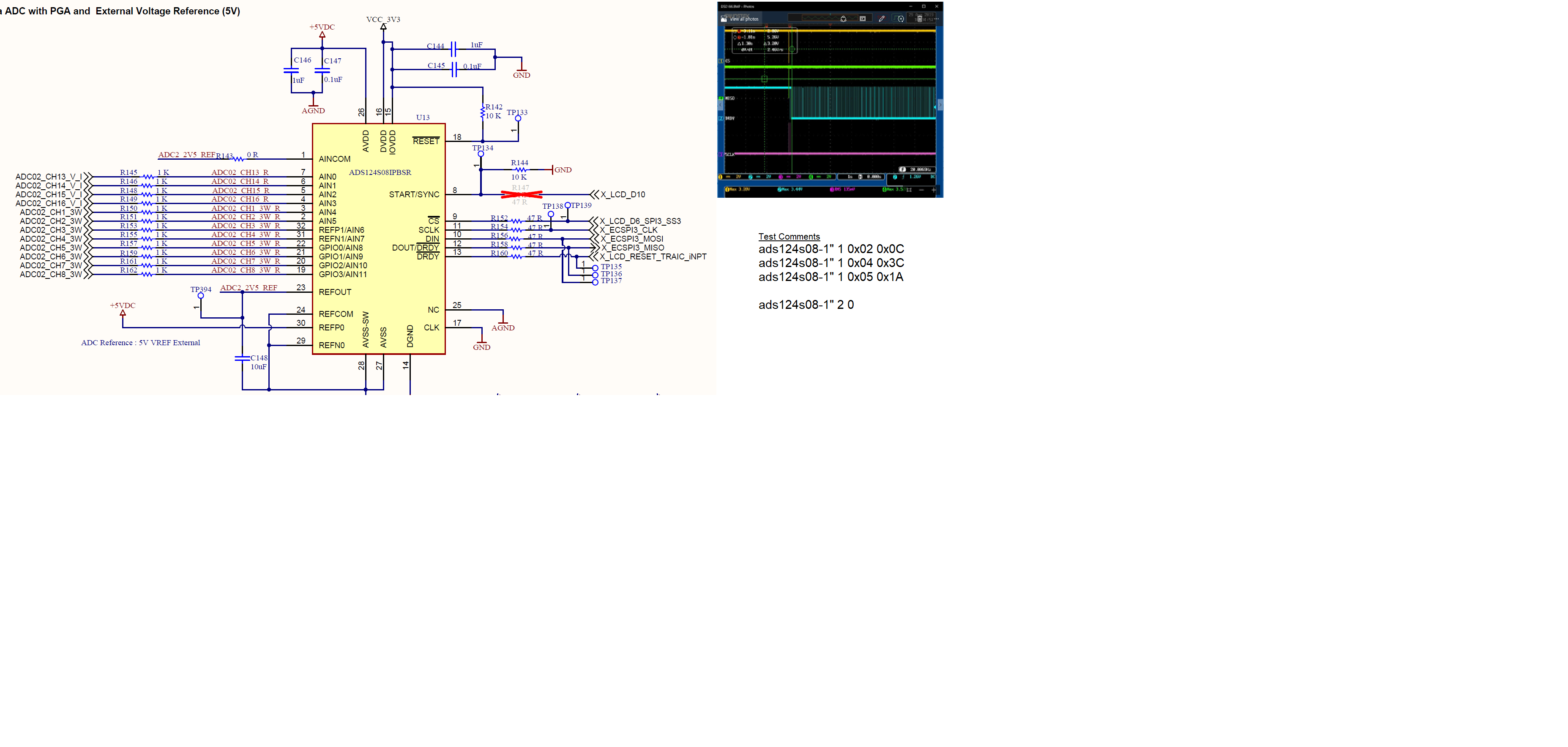 我注意到、在您的原理图中、AGND 和 DGND 是单独的接地端。  这些接地端应通过低阻抗连接(直接短接、不使用铁氧体)连接到 ADS124S08或其附近。  这可能是另一个问题、因为当模拟电源关闭/打开时、将出现电流浪涌、任何电感都可能产生电压电势。  该瞬态会影响器件的运行、该器件可能会将 ADS124S08置于不需要的状态(例如看到的连续转换)。