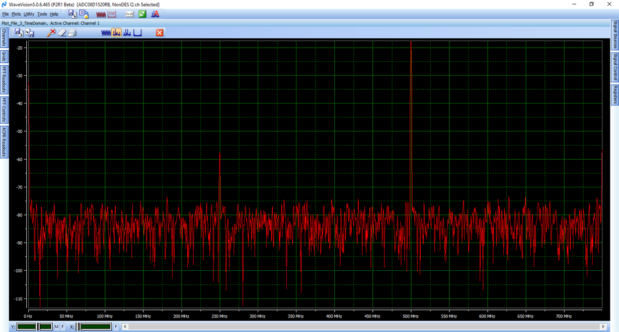 作为参考、它们实际上会向 ADC 发送1GHz 信号、读数如所示。 我们无法看到1GHz 信号,只能看到500MHz 的谐波。 您可以在 x 轴上看到、最高可测量频率似乎是800MHz。 当我们导出该数据时、它会为我们提供同样 以750MHz 结束的数据集。 我们希望发送至少2GHz 的信号。