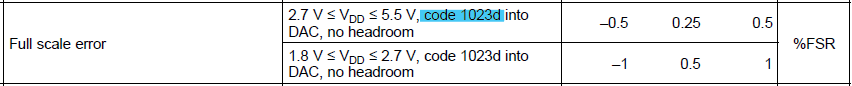 2.输出放大器需要电源余量和空间才能正常运行。 因此、当输出范围与 VDD 的输出范围相同时、电源轨附近会有一个非线性区域。 因此、INL 和 DNL 在线性范围内指定。 为了在整个代码范围内获得线性、建议在基准和电源之间提供余量
