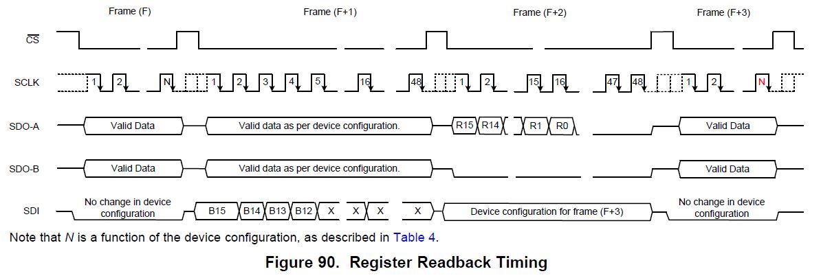 此外、无论每帧所需的 SCLK 下降沿数( 表4中列出的 N)是多少、对于所有接口模式、寄存器回读操作所需的时钟数都固定为48。 这在下面的帧 F+1和 F+2中显示。
