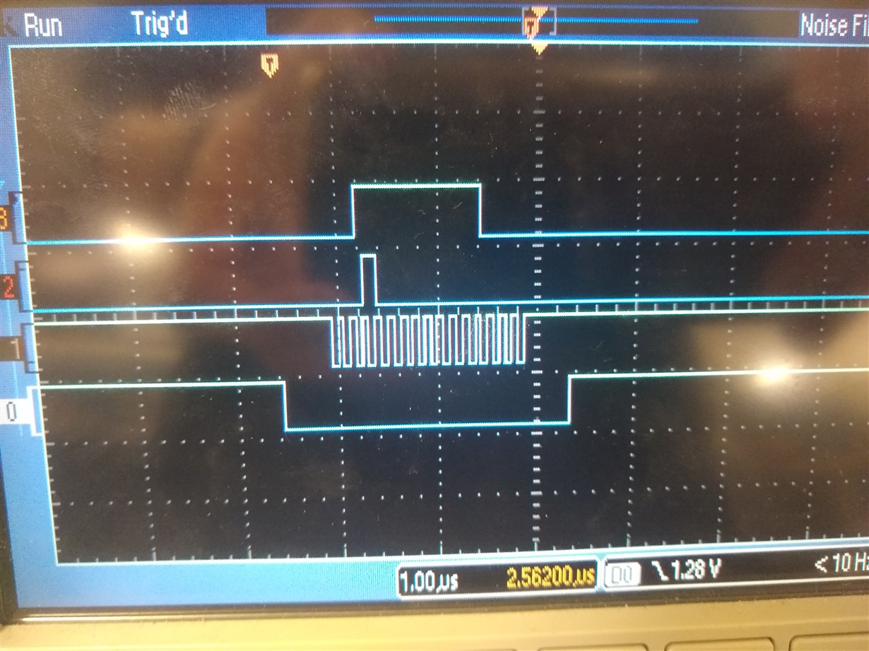 我将 ADS7853与 MSP430F249搭配使用、当我与 MSP430F249交谈时、似乎得到了额外的帧。 我在16-CLK 双 SDO 模式下以每帧16个 CLK 周期运行 ADS7853、但是在我运行第一个帧并接收数据后、我在第二个16 CLK 帧上获取数据。 如果没有第二个帧、数据块将移动到第一个帧、我不会返回任何数据。 是否需要第二个帧? 我在阅读数据表时印象中、您只需要一个帧来读取 ADC 寄存器。 我附加了两张示波器图片;一张是两个16个 CLK 帧、另一张是仅一个帧。 此外、我发送芯片的命令是0001_0000_0000_0000。