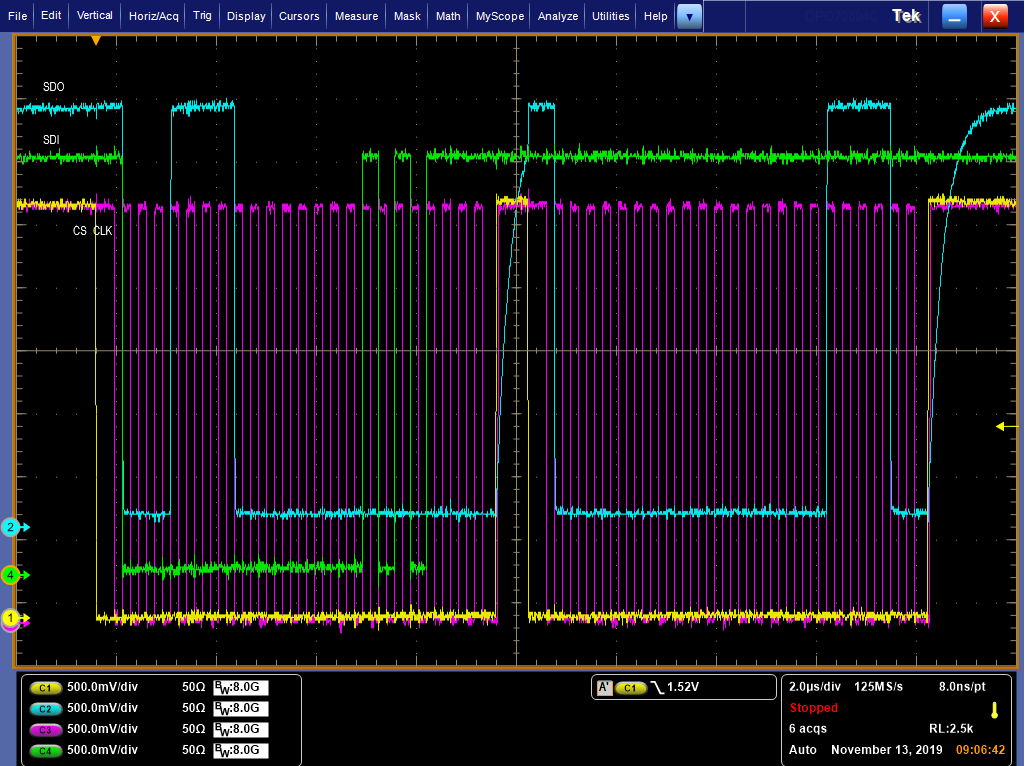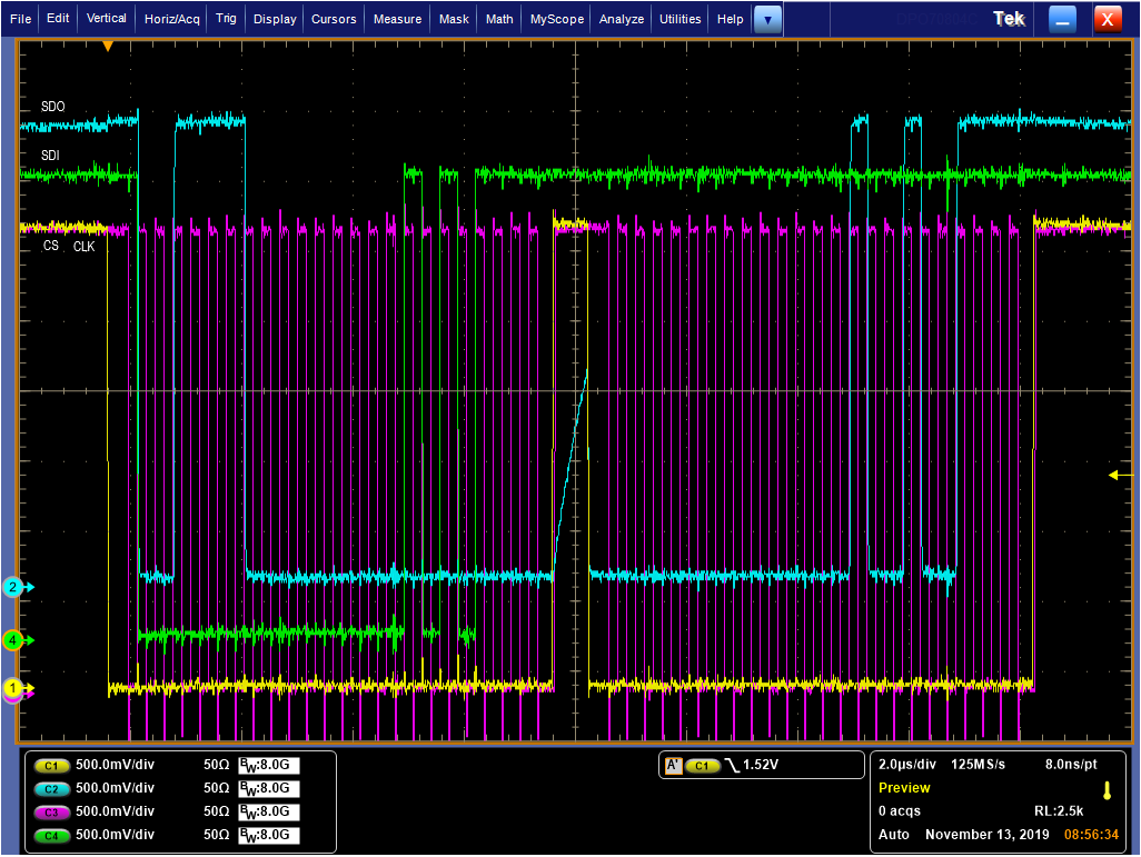 我已经尝试了4mA/8mA (默认值)/12mA、只有4mA 在我的5个测试 DAC8734芯片中都很好、在8mA 中、第三个芯片访问失败、12mA、第一个失败。 我有4mA 的 SCK 波形: