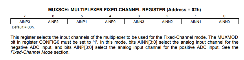 在上图中给出了 MUXSCH 寄存器的说明。 以 MUXSCH = 0X33h 为例(0011 0011是二进制值)。 因此、现在上半字节选择正 ADC 输入的模拟输入通道、而下半字节选择负 ADC 输入的模拟输入通道。
