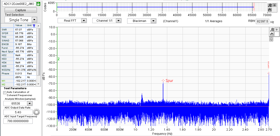 请注意、使用该 ADC EVM 和 TSW14J56 Rev D 时、JMODE0和 JMODE2支持的最大时钟速率将约为3GHz 或稍低。 在该速度以上、JESD204B 链路中存在与电路板相关的信号质量问题、这些问题会阻止数据采集。