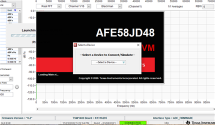 当我使用名为 AFE58JD48_ADC_Firmware 的固件时、HSDC Pro 会尝试打开 AFE 的 GUI。 当 GUI 打开时、它会显示一个对话框、要求我选择器件、但当我单击下拉菜单时不会发生任何情况(请参阅屏幕截图)。 我别无选择、只能关闭对话框。 之后、AFE GUI 关闭、因为未选择任何器件。 我每次尝试使用此固件时都会发生这种情况、即使在对 EVM 和计算机进行电源循环后也是如此。