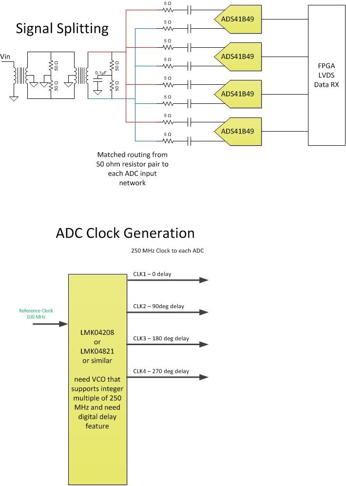 客户可以使用具有 LVDS 接口的4个14位250MSPS ADC 转换器实施解决方案(不建议在250MSPS 下使用 CMOS 接口)。 从所有转换器接收数据信号需要大量 FPGA I/O、但可以完成。 时钟解决方案将需要生成4个同步 ADC 时钟、这些时钟在时序上偏移、以实现1GSPS 的组合采样率。