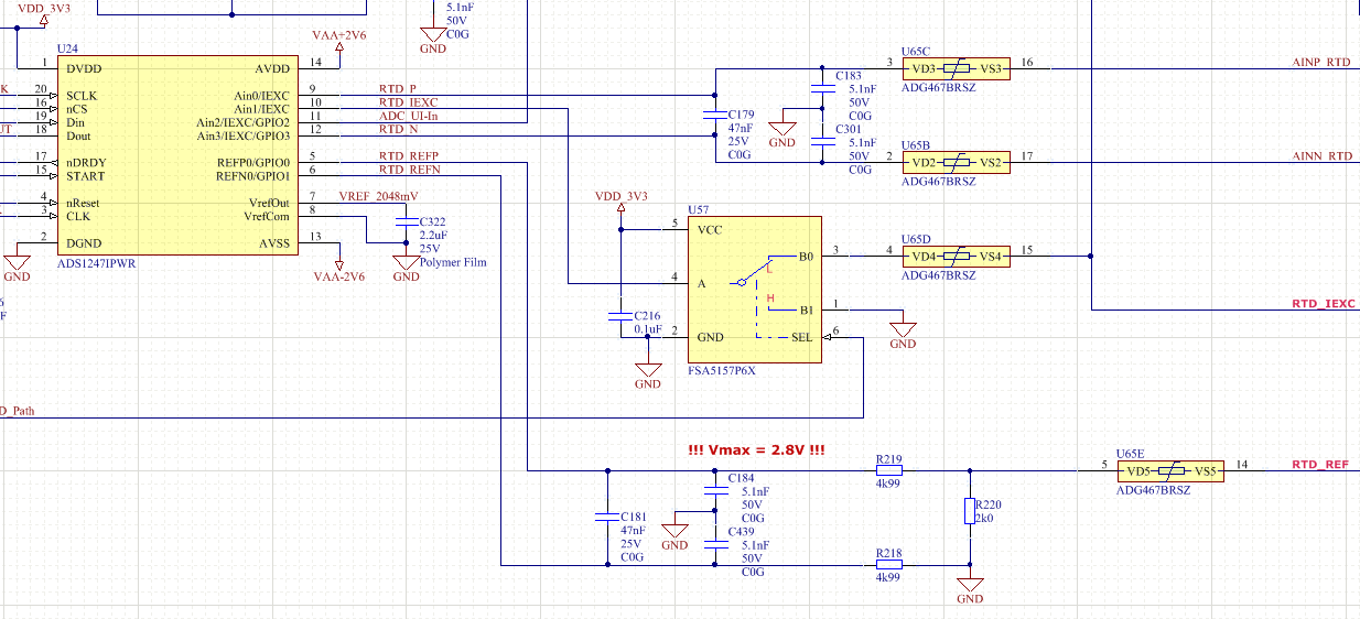 我有一些额外的问题。 ADG467的电源电压是多少? 运行 ADS1247时的增益和数据速率是多少? 拔出 RTD 并更换 RTD 后、您会看到错误。 多次读取后错误是否保持不变、或者在一段时间后错误是否消失? 您是否仅在开始时运行偏移校准? 或者在其他运行点是否有其他校准? 您提到、您偶尔会获得完全疯狂的价值。 您能解释一下在这些情况下您能得到什么吗?