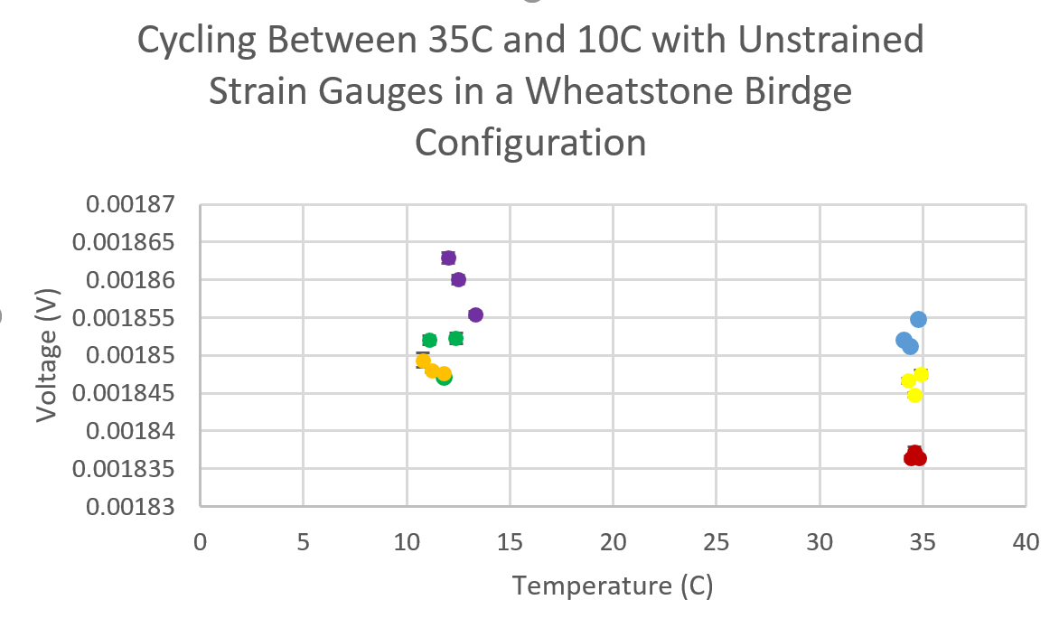 我正在使用评估板测试 ADS124S08、以确认 ADC 可用于精确的电压测量(大约为微伏)。 我一直在将应变仪连接到 EVM 的全惠斯通电桥配置中使用。 该电路不应随温度改变其输出、我正在进行测试以确认该温度。 我使用恒温器测试 ADC 是否存在温度漂移、但注意到输出电压似乎随着时间的推移而漂移、无论温度如何、大约20-30微伏、一个半小时。
