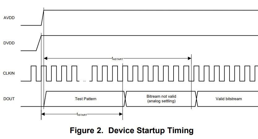 我将为您介绍 tistart 时间、一些启动行为也取决于您的 AVdd 和 DVDD 电源轨。 您能告诉我们应用时钟时器件是如何供电的? 对于模拟启动时间、.5ms 是一个典型值、它可能会稍快(或更慢)、但它仅相对于加电时的系统或者如果您松开 AVdd 电源轨并运行到失效防护运行模式(请参阅图53)。