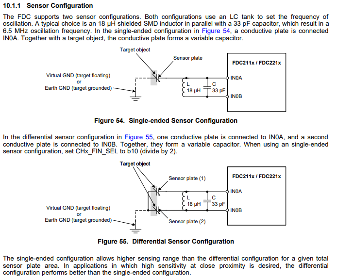 如果仅使用铜焊盘作为传感器、则无法将传感器直接连接到公共接地。 如果您将此铜焊盘连接到多个通道、则会将传感器接地并破坏 FDC2214的正常运行。 这是因为所有未被主动测量的通道都对地短路。 但是、如果您的目标接地、这将从根本上创建所需的公共端子。 如果您的系统允许使用平行铜板、则可以将它们连接到公共接地。 在这种情况下、您需要将一个板连接到 INA 或 INB、并将另一个板接地。