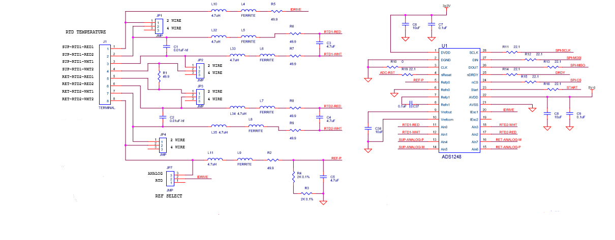读取 RTD 时遇到问题。 所有读取返回一个7FFFFF 值。 RTD 两端无法读取电压、导致我相信 IDAC 电流不会输出。 我尝试在线路中添加一个电流表、但也没有看到电流。