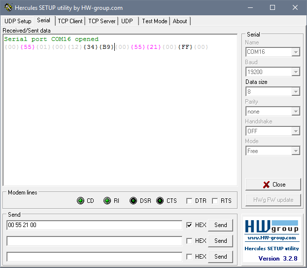 我使用了 PGA450Q1EVM 上的"Hercules RS232串行接口"终端和"PGA450-Q1_TIDA-00151_Rev2_7_DEVRAM-UART.hex"文件来确认不应出现任何 RS232-UART 通信错误。 如果您能够使用 COMMAND-0通过 UART 成功 ping PGA450、那么您还应该能够读回飞行时间数据。 下面是设置和结果示例、其中我执行了命令0和命令2、两者都返回数据: