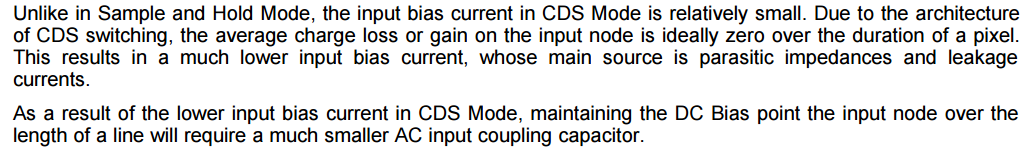 由于 CDS 传感器架构具有自参考功能、精度并不是很重要、因为不需要外部参考。 除了较小的电荷损耗外、较小的耦合电容将保持与 S/H 模式相比的直流偏置点