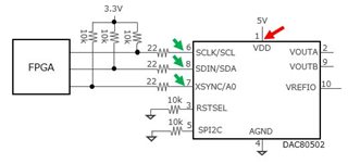 此时、3.3V 的启动速度快于驱动 DAC80502的5V、因此 SCLK/SDIN/XSYNC 的电势可能会瞬间超过 VDD+0.3V。