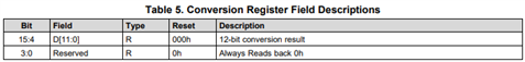1.当读取 AD 转换寄存器转换寄存器(P [1:0]=0h)[RESET=0000h]并更改收集的电压时、读取的12位寄存器值保持不变。