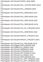 ADC12QJ1600[0] INITIALIZATION PROCEDURE write adc reg | addr : 0x0000 | data : 0x00B0 read adc reg | addr : 0x0270 | data : 0x0001 write adc reg | addr : 0x0058 | data : 0x0083 write adc reg | addr : 0x002B | data : 0x0015 write adc reg | addr : 0x005C | data : 0x0001 write adc reg | addr : 0x003F | data : 0x004A write adc reg | addr : 0x003D | data : 0x0005 write adc reg | addr : 0x003E | data : 0x0014 write adc reg | addr : 0x005D | data : 0x0041 write adc reg | addr : 0x005C | data : 0x0000 write adc reg | addr : 0x0200 | data : 0x0000 write adc reg | addr : 0x0061 | data : 0x0000 write adc reg | addr : 0x0037 | data : 0x004B write adc reg | addr : 0x029A | data : 0x000F write adc reg | addr : 0x029B | data : 0x0004 write adc reg | addr : 0x029C | data : 0x001B write adc reg | addr : 0x0201 | data : 0x0008 write adc reg | addr : 0x0202 | data : 0x00FF write adc reg | addr : 0x0204 | data : 0x0003 write adc reg | addr : 0x0062 | data : 0x0005 write adc reg | addr : 0x0065 | data : 0x0001 write adc reg | addr : 0x0057 | data : 0x0080 read adc reg | addr : 0x005E | data : 0x0003 read adc reg | addr : 0x0059 | data : 0x007F ADC[0] wait for flag : 0x01 in reg_addr : 0x208 data : 0x00 TIMEOUT! read adc reg | addr : 0x0208 | data : 0x0000
