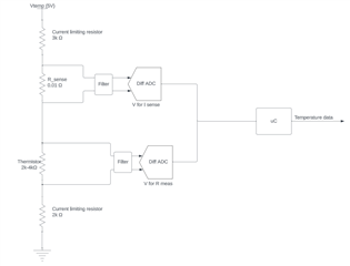 我计划使用 ADS1261来测量热敏电阻两端的电压。 我看过 RTD 测量指南、但想测量电流感应电阻器上的电压来代替 IDAC 输出。 该设计将进行大量的温度测量、因此我不想为 IDAC 输出牺牲任何 ADS1261输入。 您觉得有什么问题吗? 这是这个概念的屏幕截图。