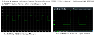 在我们由 ADS54J69制成的电路板中、函数发生器低频(1MHz 脉冲)输入的输出如下所示(图1)。