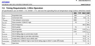 对于 ADS8860、您必须在采集阶段检索数据、当以1Msps 的最大采样率进行采样时、该值仅为290ns。 考虑到传播延迟和安静时间、支持1Msps 数据速率的最小 SCLK 频率将约为60MHz。