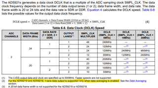 对于您的第一个问题(是)、它适用于24位、DDR、单通道和10MHz 采样率、数据行等于1的行上应出现注释上标。 似乎需要在这张表上作出一些改变。 我将提交数据表的更改以解决该问题。