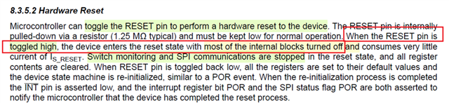 根据 DS、“当 RESET 引脚切换为高电平时、器件进入 RESET 状态、大部分内部块关闭“
