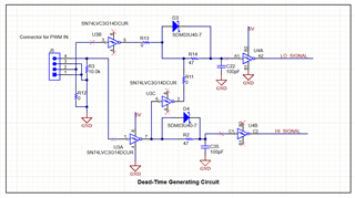 我想检查死区时间电路为什么要使用 SN74LVC2G14 + SN74LVC3G14 逆变器进行 dt 控制、为什么不直接使用 6 通道逆变器?