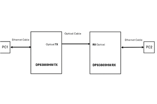 下面是我们的硬件设置、其中 有 2 个器件:TX 和 RX。 PC1 连接到 TX 器件的 RJ45 端口。 我通过 设置 0xD4[15]来启用 TX 器件中的 RX 欺骗、这会导致向 RJ45 端口环回。 因此、是否有办法丢弃 从 TX 设备 (DP83869HM TX) 发送回 RJ45 端口的数据包。