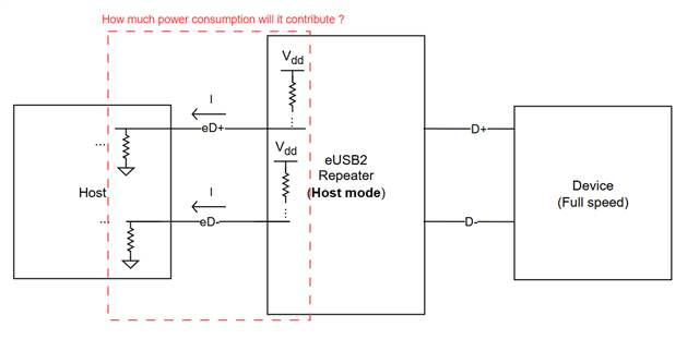 我们正在评估当系统进入现代待机模式时、使用 eUSB2 中继器可能产生的额外功耗。 (eUSB2 状态应为 L1 或 L2。)  我 在数据表中看到过相关信息。  但我不确定该值是否包括 eUSB2 总线上的上拉和下拉电阻器的影响。 请您为我们确认一下吗? 谢谢!!