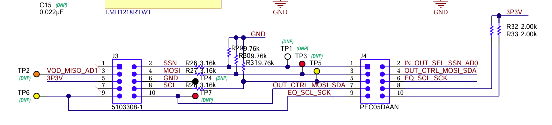 我知道在 SPI 模式下、电阻器 R26-R31 电平会转换为 2.5V、但它们是否仍然作为下拉电阻器连接到 SMBus 模式、或者它们是否未使用? 同样、是否由 SMBus 中的 USB2ANY 使用引脚 3 也不清楚、因为这是 LMH1218 器件注册的地址位、用于设置 I2C 地址和通过电阻器设置。