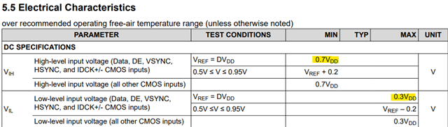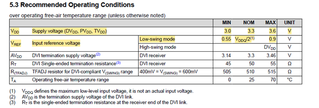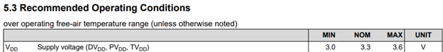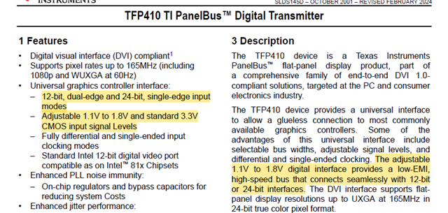 由于我不支持 TFP410、因此我可能会遇到问题、但我看到 VDD 需要 3.0V 至 3.6V 的电压