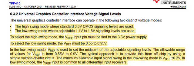 我在数据表中已经看到、它 也可以支持低摆幅模式以及  1.1V 至 1.8V 信号电平。 下面是数据表说明。