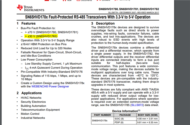 我在 设计中使用SN65HVD1782D,该项目已投入批量生产。 但最近我们遇到了 RS485通信不稳定的问题。 有时,RS485无法工作。