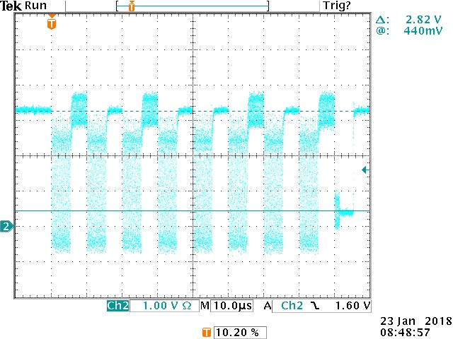 我有一个使用TCA9406的板,用于连接3.3V逻辑外部逻辑和5V内部逻辑。 外部逻辑在主板上,我的主板通过短电缆连接到主板。 我的主板生成一个本地+3.3V以为9406的"A"侧供电。 我的主板上只有一个I2C设备,它是I2C从属设备。 主板工作正常,我可以将其连接到Raspberry PI,例如,一切都很好。 但是,当我将其连接到客户主板时,TCA9406就会振荡。 SDA和SCL线在正常100kHz波形之上具有20MHz的振荡。 客户的I2C总线负载很重,有许多5K上拉电阻器和印刷电路板跟踪存根,无处不在。