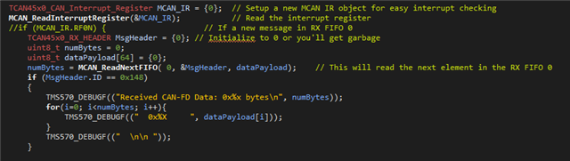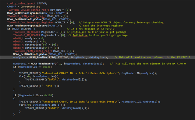 感谢您来到 E2E、向您提出有关 TCAN4550-Q1的问题、因为这是一款复杂的器件、我们随时为您提供支持。 但是、我们无法完全支持您的软件开发、我觉得这就是该线程所实现的。 Eric Schott 在您开发和设计自己的代码时可以回答问题、但他不能为您审阅和编写代码的整个部分。 代码的用户需要对其进行开发、以便为项目提供长期支持、如果 TI 离开设计软件、我们将无法长期支持该软件。
