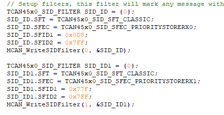 此处显示的滤波器配置看起来正确。 这定义了两个标准 ID 滤波器、它们将在 FIFO0中存储接收到的 ID = 0x0D5的帧、在 FIFO1中存储 ID = 0x77F 的帧。 在给定中断处理代码的情况下、0x77F 似乎不是预期接收的 ID。 是否需要将第二个筛选器配置为接受一系列 ID? 如果是、请使用滤波器 SFT 的范围滤波器设置。