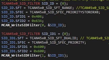 MRAM 是否已配置为存储两个 SID 过滤器? 演示代码只分配一个 SID 和一个 XID 滤波器元素(下面的第12 - 13行)。 由于您使用两个 SID 滤波器元素、因此需要对其进行调整。 未使用的 XID 滤波器元素也应未分配、因为未配置的元素可能会导致未定义的行为。