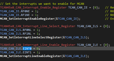 TCAN45x_Init.c 文件此处启用了 m_CAN_INT1、这意味着 GPO2被选中中断。