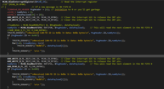 我在 TCAN4550中有一个直接的问题:接收 CAN ID、RXFIFO 0工作正常、但我无法接收 RXFIFO 1和 RX 缓冲器。 请帮我处理 RXFIFO 1和 RXbuffer 配置的演示代码以及接收代码支持、这已经足够了。