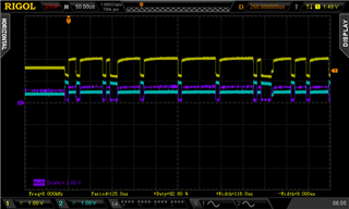 我将一对 SN65HVD72连接在一起。 它们由3.3V 电源供电、并通过试验电路板上的一些短双绞线进行连接。 包括一个100欧姆的终端电阻器。 当我第一次连接它们时、数据经过的过程很顺利。 然后、在不涉及任何内容的情况下、我开始遇到 CRC 错误。 在我的示波器上、差分信号看起来很奇怪、并且不一致。 我已经尝试过 DI 引脚上的各种附加上拉电阻器以及 A 和 B 线路上的偏置电阻器。 整个设置在之前与 ISL32603配合使用时效果良好。 有什么想法吗?