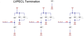我强烈建议您验证光纤收发器摆幅是否在抖动、收发器时序要求和电压电平的822IF 规格范围内。 您可能需要在收发器线路上使用上拉电阻器来调节电压电平。 我已附上 DP83TC822 EVM 用户指南 https://www.ti.com/lit/pdf/snlu179中的符合 LVPECL 时使用的端接图像