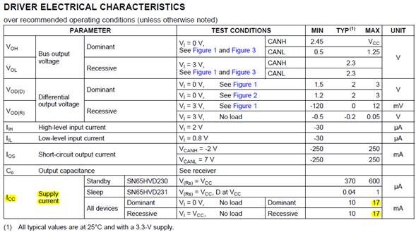 在数据表中、我们可以发现显性/隐性模式的电流为17mA (最大值)。