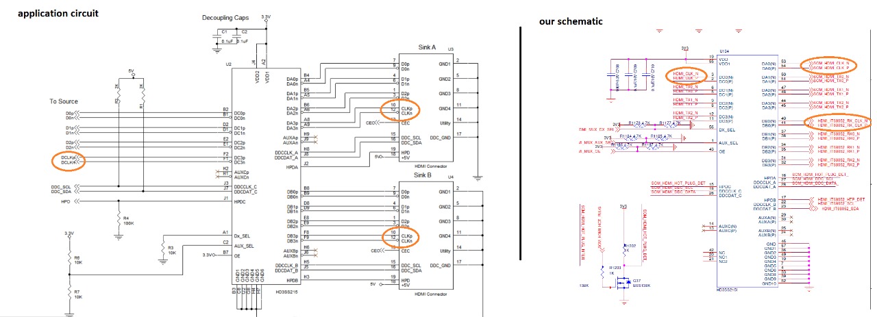 我将 HD3SS215I 用于我们的其中一个应用。 我有1:2配置、带有 HDMI 源和连接器。 一侧连接到 FPGA、另一侧连接到连接器。 由于数据和时钟信号交叉、我面临着路由挑战。 因此我断开了连接。 DC0连接到时钟、DC1:DC3连接到数据线。 下面是原理图。 我希望有人验证并确认它是否正常工作。