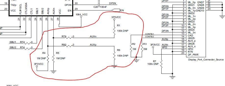 我想知道为什么在 TUSB564 EVM 原理图中将 AUXP/N 电阻器(R4、R5)标记为 DNP、而在 TUSB564数据表中、这些电阻器被认为是必需的?