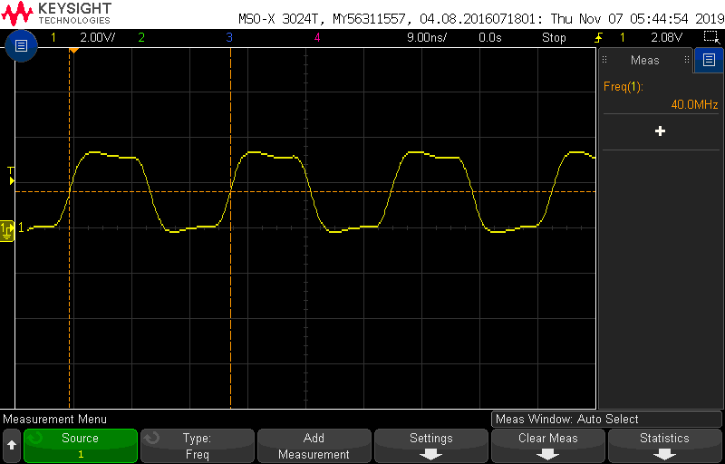 输入时钟的测量频率为40MHz、符合预期(通道1、黄色)。 输出 TMDS CLK+为3.3V 纹波电压(通道2、绿色)。