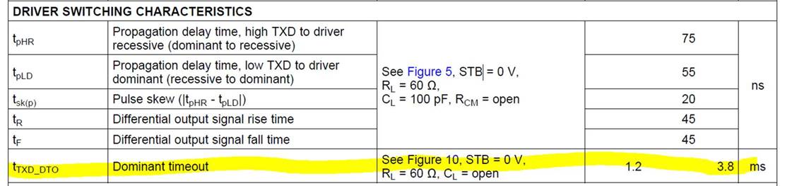 虽然 ISO 11898将显性超时视为可选功能、但它在标准多节点网络中非常重要。 如果在单个节点中发生故障、导致驱动器持续拉显性、则其他器件将无法使用总线进行通信。 超时允许此类故障节点释放对总线的控制、从而允许其他节点进行仲裁并继续通信。