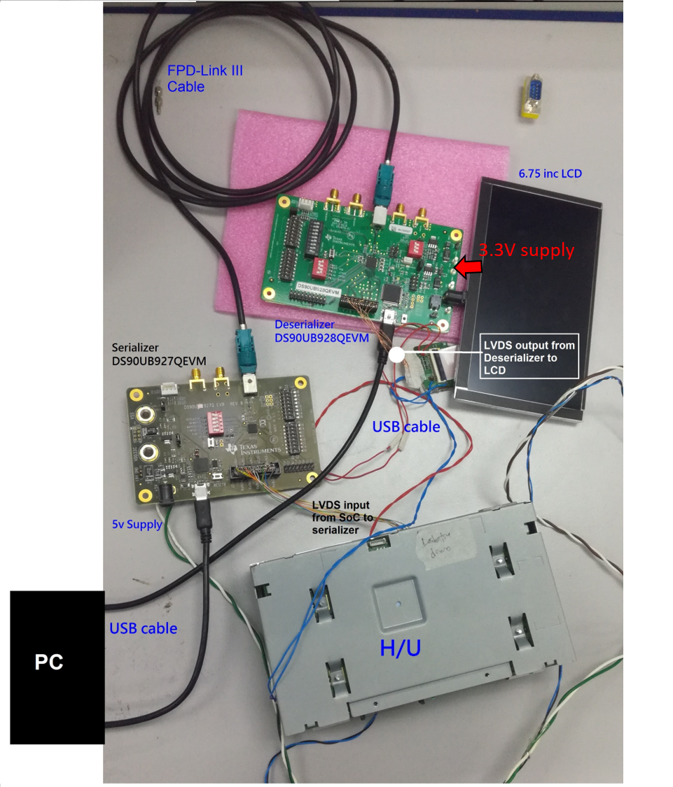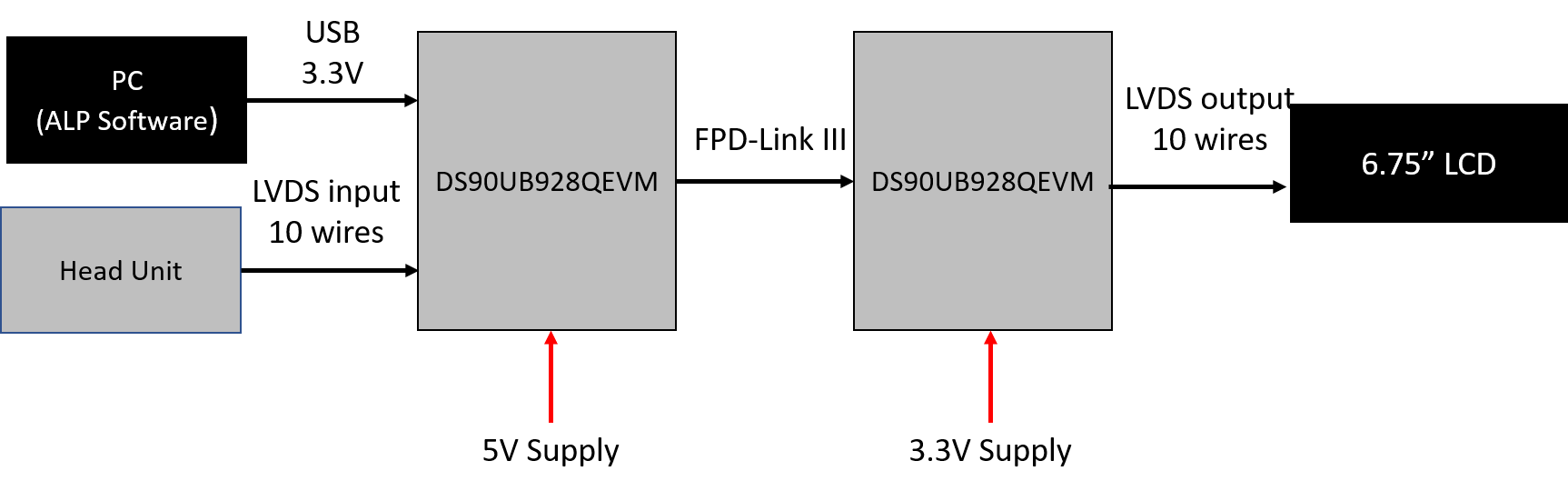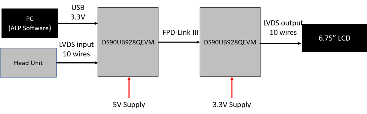 我的客户打算使用 DS90UB927QEVM 和 DS90UB928QEVM 将 LVDS 信号从音响主机输出到 LCD、如下图所示。