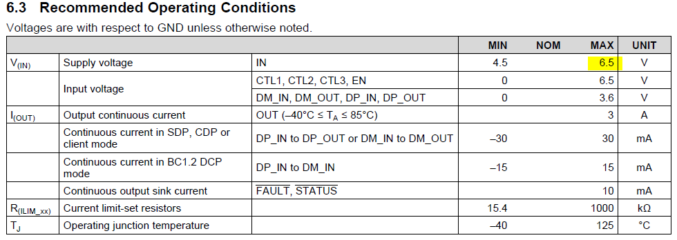 我不建议为系统提供6.5V 电压、因为最大工作电压为6.5V。 任何高于此值的部件有损坏风险的部件。 我建议将电压降至5V、以确保器件不会损坏。