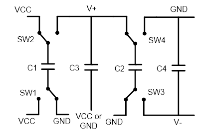 这些电容器是电荷泵的一部分、可为驱动器生成输出电压。 "飞跨"电容器 C1用于为 V+充电。 反相电容器 C2将 V+反相以对 V-进行充电。 C3和 C4是储能电容器、当 C1和 C2发生开关和充电时、可保持充电 V+和 V-。 请参见下图。